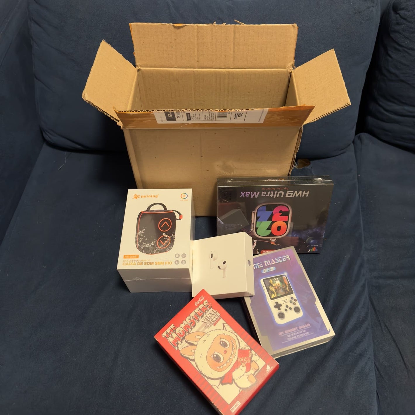 Entre os itens que podem aparecer nas caixas, temos produtos da maça. No entanto, vale ressaltar que esses itens são produtos premium de alguns produtos da marca. Fones de ouvido, relógios e carregadores por indução da maça estão entre os produtos que você pode receber. Esses produtos são de alta qualidade, projetadas para oferecer uma experiência bastante semelhante aos modelos genuínos da maça, com design e funcionalidade extremamente fiéis. Porém, não se trata de produtos genuínos da maça, mas sim de produtos premium, com ótimo custo-benefício, para quem busca qualidade e um preço mais acessível.